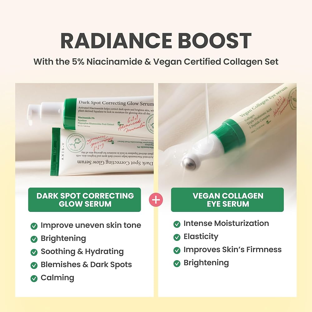 مجموعة Glass Skin من AXIS-Y تضم سيروم تفتيح للبقع وسيروم عين بالكولاجين النباتي، لتوحيد لون البشرة وتقليل الهالات بتركيبة نباتية لطيفة.