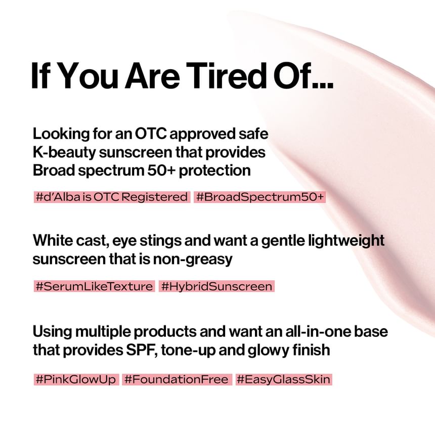 مع d'Alba - Waterfull Pink Correcting Tone-Up Sunscreen، اجمعي بين الحماية اليومية والتفتيح الفوري بفضل تركيبة نباتية خفيفة ترطّب وتوحد لون بشرتك في خطوة واحدة.