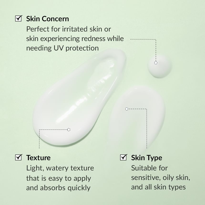 كلمات مفتاحية: واقي شمس، حماية من الشمس، بشرة ناعمة، ترطيب، شاي أخضر، Centella Asiatica، Houttuynia Cordata، بشرة حساسة، ترطيب عميق، منتج نباتي