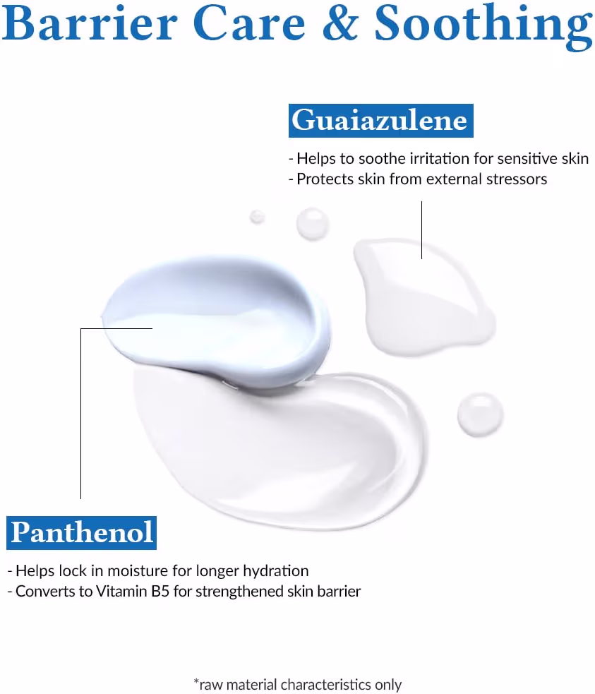 - Guaiazulene: يقلل الاحمرار، يعالج التهيّج، ويعيد التوازن للبشرة الحساسة.