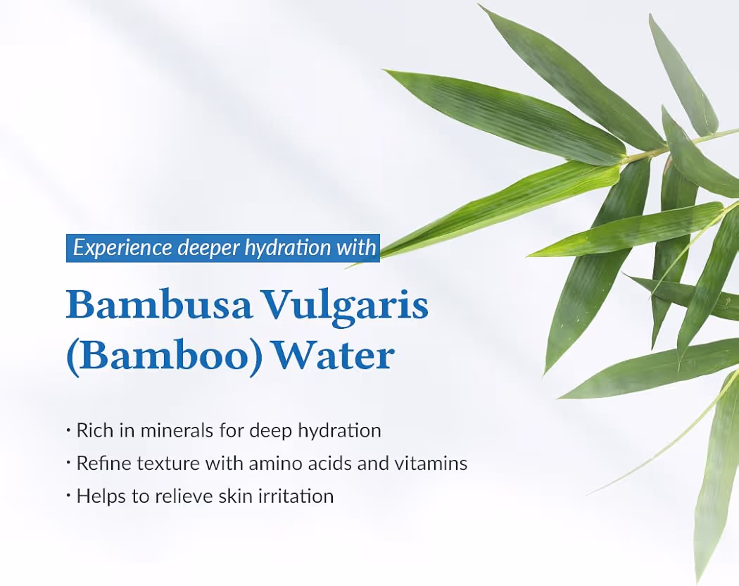 - Bambusa Vulgaris Water (70%): يرطب ويهدّئ ويمنح انتعاشًا طبيعيًا.