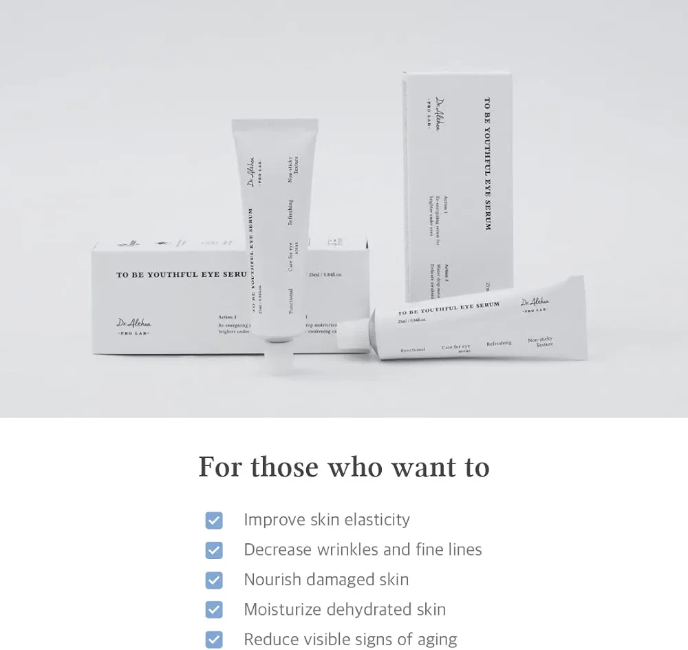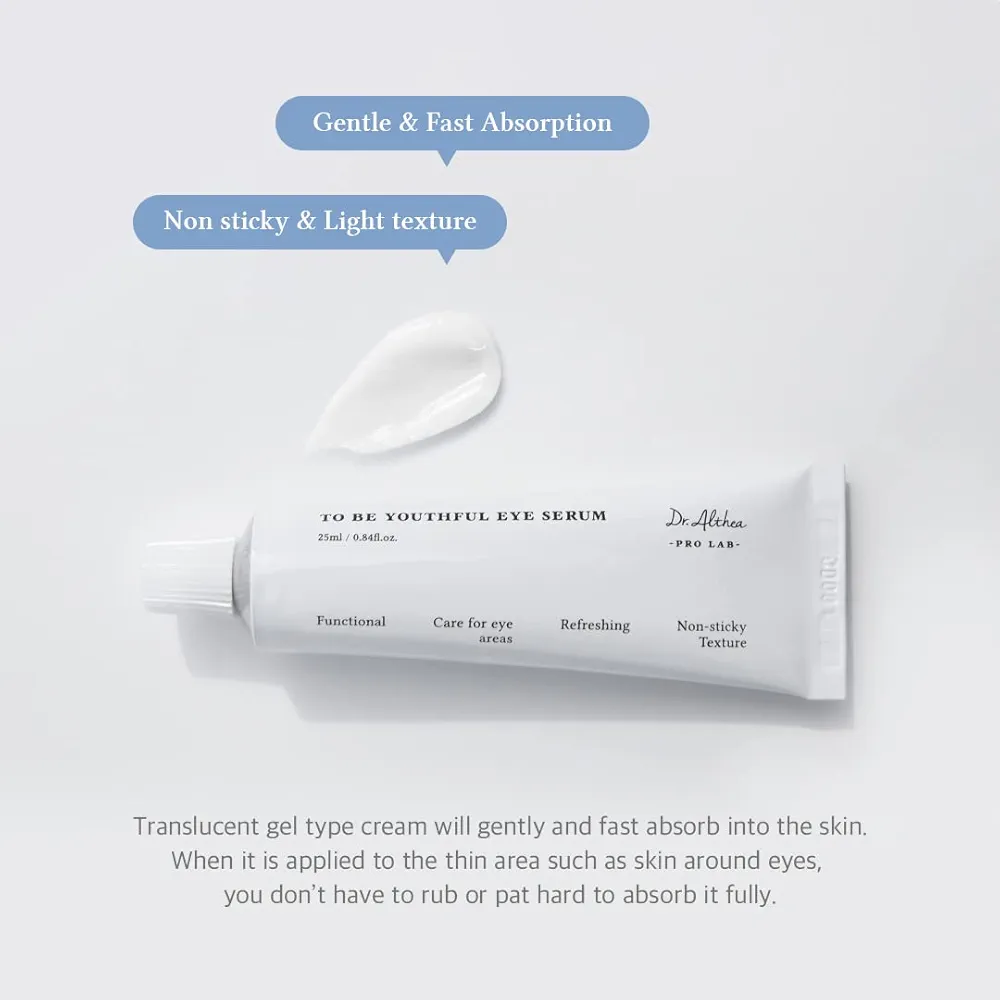 جدد شباب عيونك مع **Dr. Althea - To Be Youthful Eye Serum**، سيروم العين المثالي الذي يعزز إشراقة المنطقة الحساسة حول العين. يحتوي على **فيتامين C** لتفتيح البشرة، **الكاتيشين** لمكافحة الأكسدة، **الشاي الأخضر** لتهدئة البشرة و**مستخلص البابونج** لترطيبها.