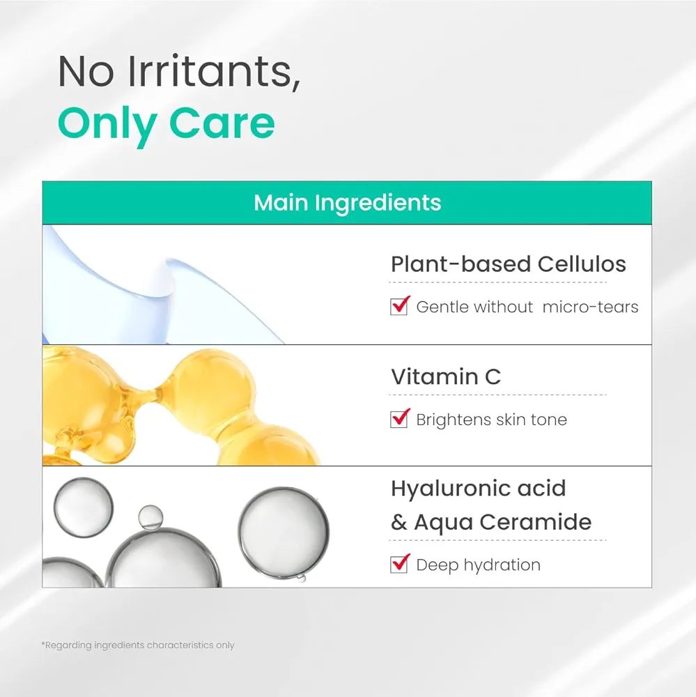 - تقشير لطيف وغير مُهيِّج: بفضل السليلوز الطبيعي الذي يلتقط خلايا الجلد الميتة بلطف دون خدش البشرة.