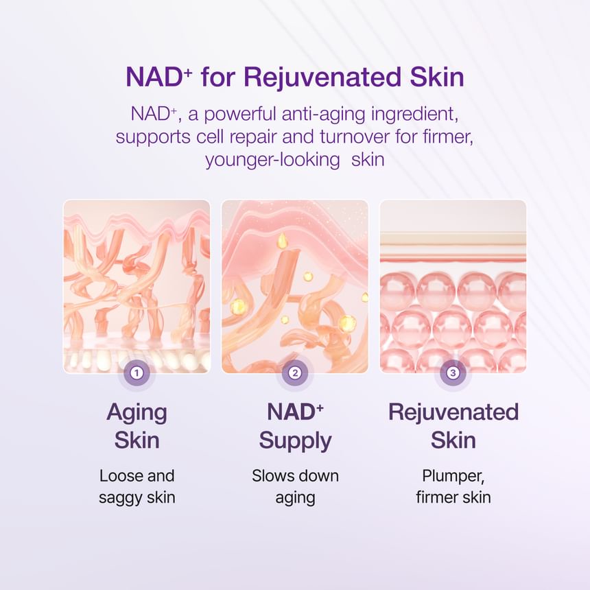 🔹 NAD+ يعزز عملية تجديد البشرة، مما يساعد على تقليل التجاعيد وتحسين مرونة الجلد.
