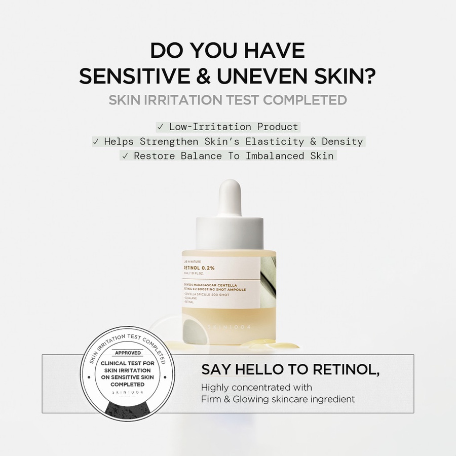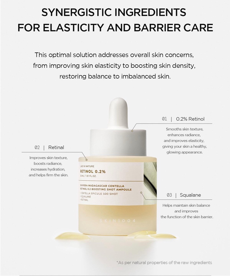 امنحي بشرتكِ عناية متقدمة مع أمبولة SKIN 1004 - Madagascar Centella Retinol 0.2 Boosting Shot، المصممة خصيصًا لاستعادة شباب البشرة وتحسين مرونتها من العمق.