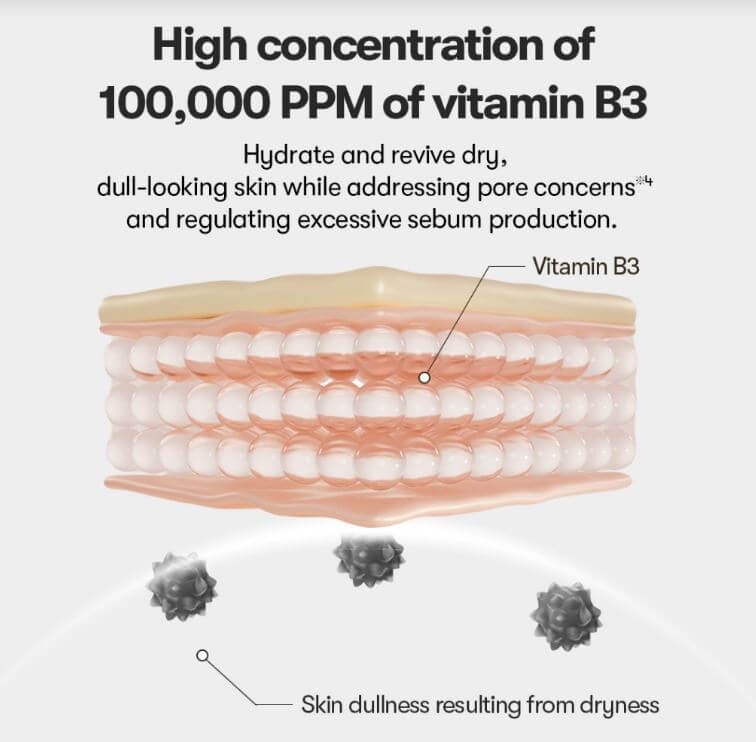 نياسيناميد، بانثينول، حمض الهيالورونيك، خلاصة السنتيلا الآسيوية، بروبوليس، ريتينول، فيتامينات متعددة، وسكوالين نباتي لتغذية البشرة ومنحها إشراقة صحية.